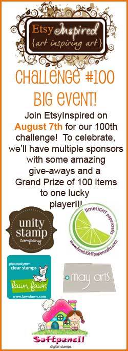 Welcome friends and new visitors! I'm glad you've stopped by to celebrate the 100th Etsy Inspired Challenge with me. I so enjoy being a part of this team and sharing my Etsy Inspired projects with you all every week. Since this week marks the 100th challenge we have all sorts of inspiration and prizes for you to enjoy! With sponsors like Unity Stamp Company, Lawn Fawn, May Arts, Limelight Papercrafts, Soft Pencil Designs, and Charleston Scrapbooking you are going to want to be sure to visit each of the Design Team members' blogs and check out the